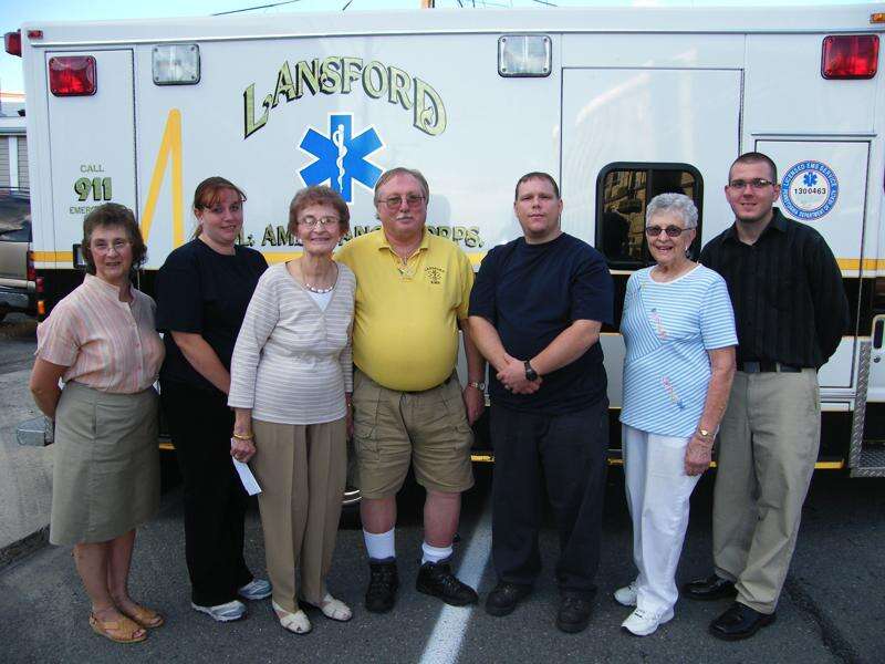 The Lansford branch of the First Catholic Slovak Ladies Association donated $500 to the Lansford Fire Company. Presenting the check was auxiliary president Veronica Bazik along with Mary Ciganek, vice president; and Louise Dunstan, treasurer/financial secretary. Accepting the check are fire company members front, Mark Kosica, Jason Diehl. Back row are Chris Aungst, Ron Hood, Bryn Zellner, David Aungst, and Mike Doerr.