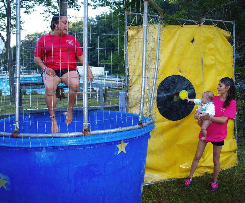 A Family Fun Day was held recently at the Bungalow Park in Tamaqua to benefit the Tamaqua are Relay For Life. The community event consisted of food, music, games, prizes, inflatable bouncy gym, and a dunk tank. Event organizer Jenn Miller, from Tamaqua, stated her appreciation to all the volunteers, patrons, contributors, and key event sponsor Larry Frederick, owner of Freddy's Pub in Tamaqua. She also pointed out her appreciation to the Citizens Fire Company for donating the use of their dunk tank and inflatable bouncy gym. Representatives from the Carbon-Tamaqua Chapter of the ACS were also on hand during the event. The event raised $1,024.65 for the Carbon-Tamaqua American Cancer Society Tamaqua area Relay For Life. Both DJ Mixx and Lord Pistaccio Band donated their services for the event. In top photo volunteer Dorothy Wagner, Tamaqua, gets ready to take a plunge courtesy of her granddaughter Riley Wagner, 8 months, and daughter Dorothy Vasquez. In bottom photo Jackie Wilson, 12, left, and Brianna Ortiz, 12, center, both from Tamaqua, take a chance at the roulette wheel.