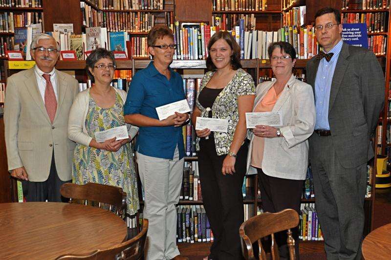 The Carbon County Bar Association gave a donation of $3,000 to each of the operating libraries within Carbon County. Present at the Dimmick Memorial Library in Jim Thorpe on Thursday for the presentation of checks to representatives of the libraries were, left to right : Atty. Anthony Roberti, Bar Association Law Journal Committee; Ruth Isenberg, President Board of Trustees Weatherly Area Community Library; Diane Danielson, Palmerton Area Library; Becky Wanamaker, Lehighton Area Memorial Library; Susan Sterling, Dimmick Memorial Library Director; and Atty. James R. Nanovic, Bar Association Chancellor.