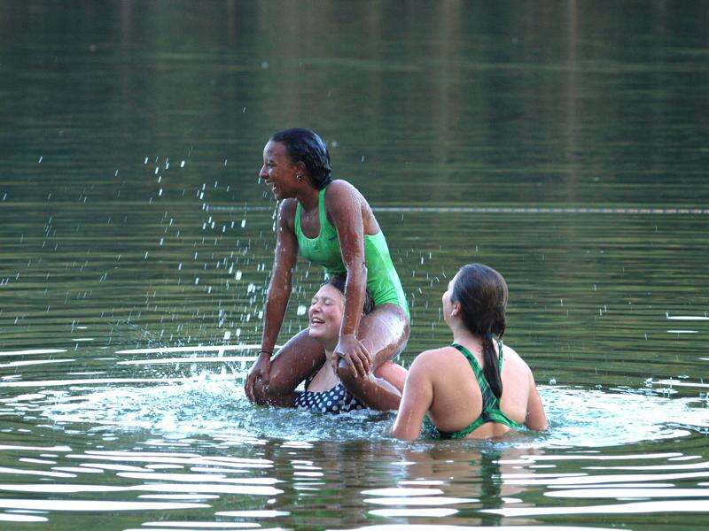 Youngsters enjoying their Labor Day and day off from school while playing in the water at the Tuscarora State Park beach are Sadie Alexander, 13, on shoulders of Kali Albaugh, 13, and with Jamie Albaugh, 11.