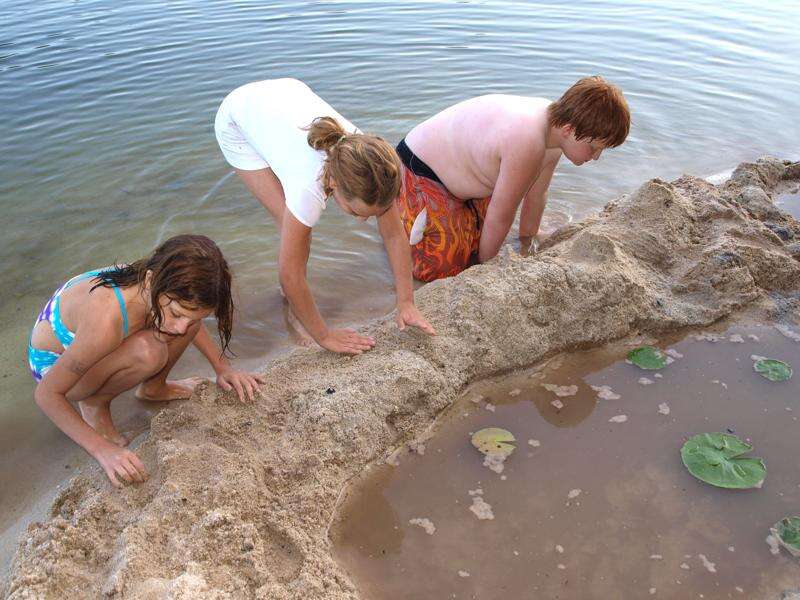 A lot of youngsters spent their Labor Day weekend and day off from school by playing in the sand at the Tuscarora State Park beach. Pictured building a mini-sand lagoon from left are Emily Zane, Sarah Zane, and Donald Kalb, all aged 10 and from New Tripoli.