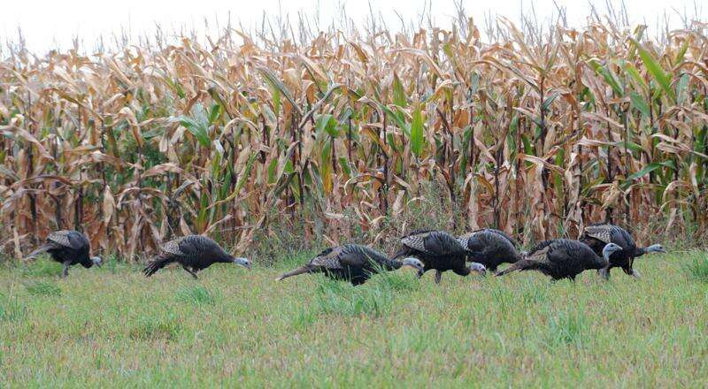 A flock of young turkeys appears to be enjoying its fest of corn Thursday afternoon in a remote area of Franklin Township. The flock was feasting on corn from an adjacent corn field, a long time favorite spot.