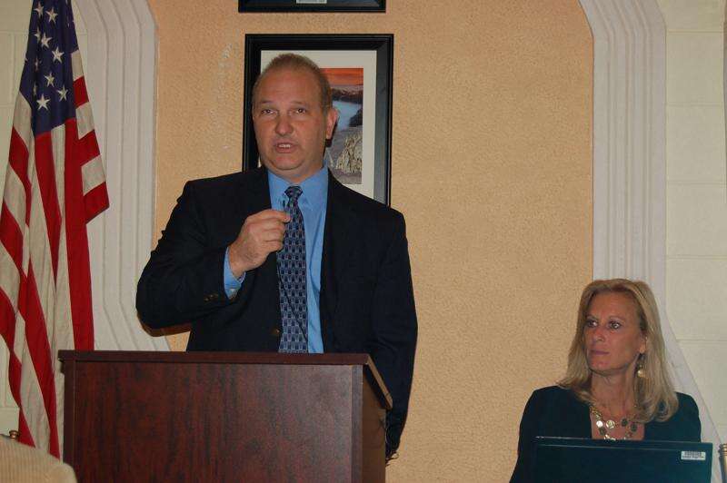 JOE PLASKO/TIMES NEWS Joseph Pilla, 2011 Tamaqua Area United Way campaign chairman, speaks during the campaign's kick-off breakfast at DiMaggio's La Dolce Casa. At right is Susan Fegley, assistant campaign chair.