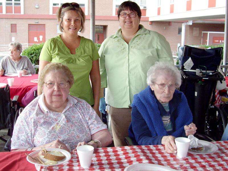 Members of Preceptor Alpha Upsilon Sorority treated residents of St. Luke's Miners Memorial Geriatric Center to an end of Summer picnic on Sept. 11. The event was held at St. Luke's Pavilion, Coaldale. Pictured are center residents Bev Job and Theresa Risko; (second row) Sorority Service Chairwoman Helen Walters and Sue Hummel.