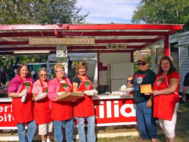 Palmerton Community Festival strawberry shortcake anyone? These fine ladies working at the Palmerton Hospital Auxiliary stand Saturday afternoon took time out to ham it up for a quick picture. This was the thirteenth-year the auxiliary has been making the delicious dessert. The volunteers' matching strawberry aprons add a special touch to their booth. It was even rumored that one gentleman drove over one hour just for one of the yellow cake squares, topped with sweet strawberries and piled high with whipped cream. Left to right, stand workers, Elaine Walters, Evie Plechavy, Carol Hoffacker, Renata Allen, Gaye Eckhart, Raymond Gower (happy customer) and Levina (Lovey) Irvin look forward every year for the Palmerton Community Festival.