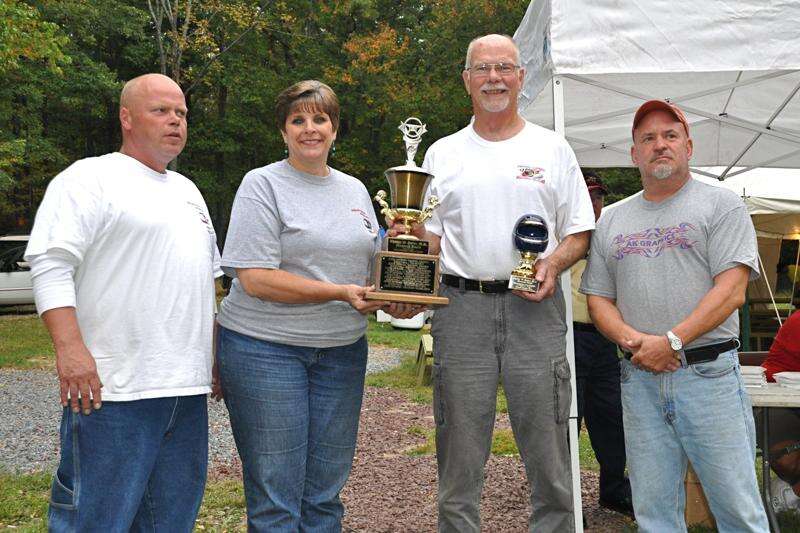 Victor Izzo/SPECIAL TO THE Times News North Carolina driver and new hill climb record holder George Bowland receives the Charles W. Potter, M.D. Memorial Award at the conclusion of the event. Pictured at the presentation are, from left, Weatherly Mayor Tom Connors, Dr. Potter's daughter Becky Potter Gregory, Bowland, and Joe Cyburt, councilman and president of the Weatherly Hill Climb Association.