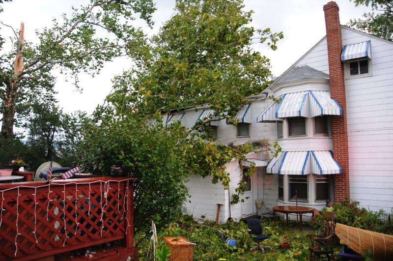 Larry Neff/times news Evidence of the vicious storms that rolled through the region are obvious in these two scenes from Jim Thorpe. At left, the high winds collapsed a tree against a residence at 127 South Ave., causing a considerable amount of damage. The family did not stay in their home overnight due to several branches penetrating the walls, roof and ceiling of the upper floor of the wood-frame dwelling. No injuries were reported in the incident. In right photo, fire department personnel clean up a fallen tree blocking the highway as police handle traffic at the intersection of Second and North streets (Route 903).