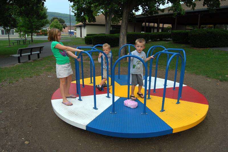 Kelsey Murray, 10, Connor Miller, 4, and Braden Crissy, 5, all of Jim Thorpe, enjoy the summer-like temperatures while riding the spinning wheel at the Jim Thorpe Memorial Park playground. Cooler weather is expected this weekend, however, and the five-day forecast predicts temperatures not rising above the mid 70s.