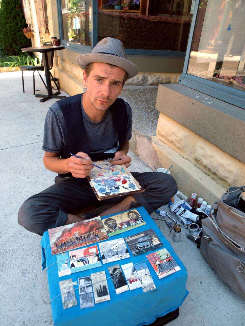Tourists strolling the streets of Jim Thorpe's Historic District stop along the sidewalk outside the Strange Brew Coffee Shop to watch a young man create striking images - art from matchbooks.