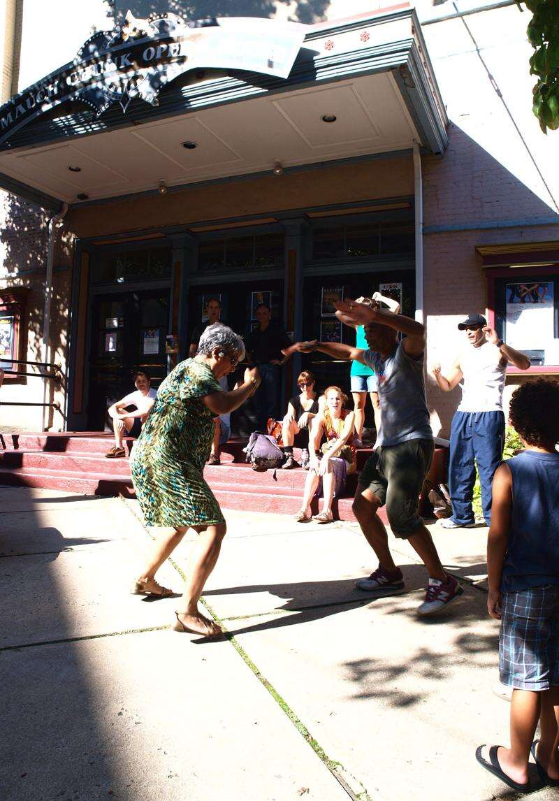 Zumba instructor Naomi Betancourt joins dancer Garrett Jones to salsa dance outside the Mauch Chunk Opera House in Jim Thorpe. Jones performed Saturday evening at the Opera House in Concert Dance Inc.'s production of El Salón.