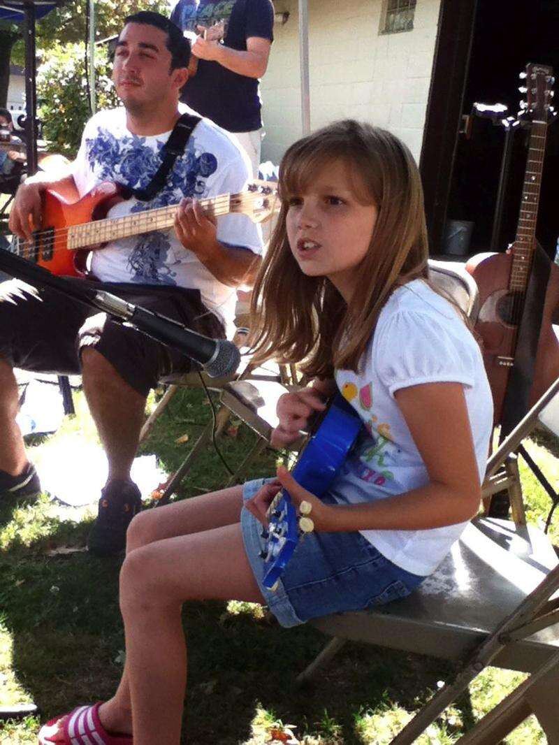 With Jared Soto playing bass guitar in the background, nine-year-old Jocelyn Phillips entertains on ukulele at the recital for Ukulele Institute Recital in the Jim Thorpe Memorial Park.