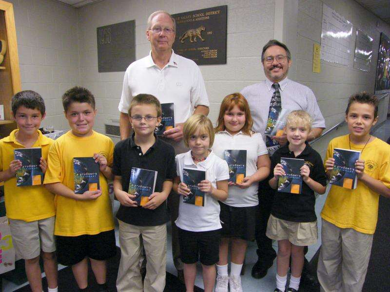 The Panther Valley Elementary School third graders received 144 dictionaries from Francis X. Koomar and William P. Gardiner of Nesquehoning. Accepting the dictionaires on behalf of their class are Joshua Robin, Blake Morgans, Andrew Surotchak, Kaylee Bukowski, Lindsie Borger, Alena Vogt, and Braxton Whitaker. Behind them are William Gardiner, presenter and Bill Lombardo, PVES principal. Missing from picture is the other presenter, Francis X. Kommar. This is the ninth year that Koomar and Gardiner have been participating in the "Dictionary Project". Each third grader in the Panther Valley Elementary School will put their names on the inside cover as it is their personal dictionary to keep. The goal of the Dictionary Project is to improve the reading ability and comprehension of all children everywhere. Educators see third grade as the dividing line between learning to read and reading to learn. Seven dictionaries were given to Our Lady of the Angels Academy in Lansford.