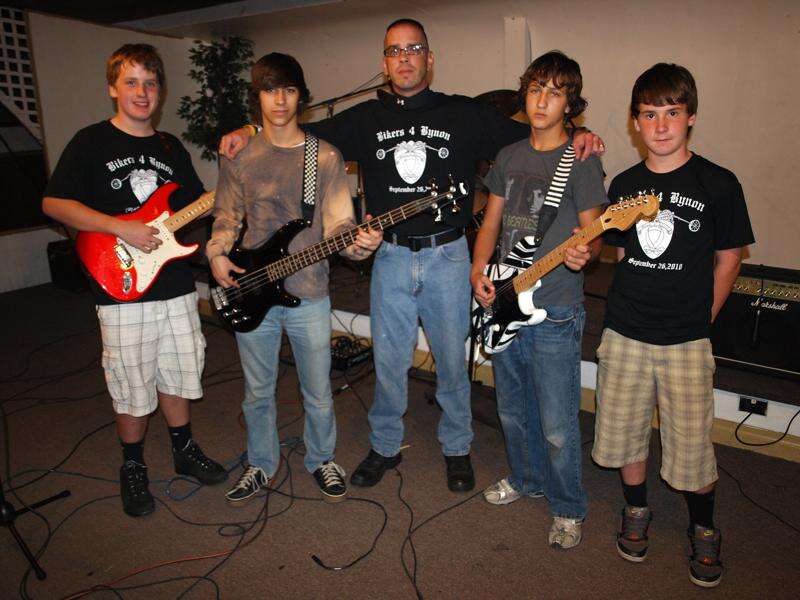 Young members from the "A.D.D." band pose with Tamaqua Police Officer Matt Bynon, who is stricken with cancer, while volunteering their time to play at the recent Bikers 4 Bynon benefit held recently to raise funds for Officer Bynon's accruing medical expenses. Pictured from left are