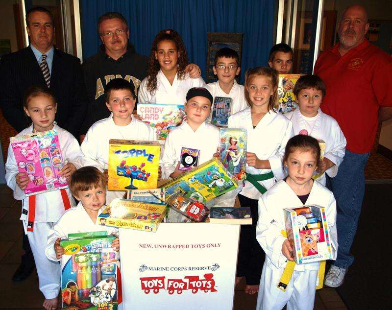 The Coal Kickin' Children's Fall Karate Tournament collected a full box of new toys for the Schuylkill Carbon Marine Corps League's Detachment 626's annual Toys For Tots drive. Pictured with some of the donations are third row from left, Coal Kickin' Children's Tournament Director and Sensei Kevin Dillon, Mark Janner, Allisa Cruz, 13, Brian Lewis, 11, Anthony Yerger, 14, and Schuylkill Carbon Marine Corps League member and Toys For Tots volunteer Joe Sweeney. Second row from left, are Samantha Dillon, 9, Tyler Locher, 9, Andrea Tizekker, 7, Christina Dacey, 10, and Michael OBrien, 10. First row from left are Connor Dillon, 5, and Alexandra Janner, 7.