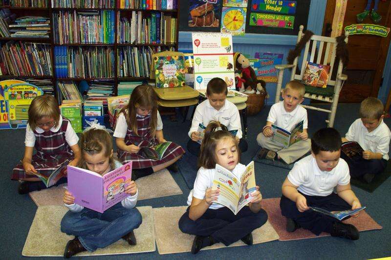 SPECIAL TO THE TIMES NEWS First Graders from Our Lady of the Angels Academy, Lansford, read books as part of the Scholastic Book Club's ClassroomsCare Program. Students include, Front row, left to right: Sadie Trubilla, Emilia Tenisci, and Edward Mullen. Back row, Sierra Bauer, Hannah Soberick, Rilan Gombert, Matthew Rehrig, and Brayden Feisel.