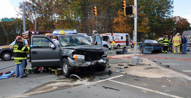 Three people were injured in a two-vehicle crash in Hometown, Rush Township, on Saturday, Oct. 16. At 12:44 p.m. township police responded to a motor vehicle accident on Claremont Ave.(SR309) at Tide Road at the Walmart store entrance. A 2001 GMC truck was traveling north on Claremont Ave. when a 1997 Dodge attempted to turn from Claremont (southbound) onto Tide Rd. The Dodge was operated by Theresa Saylor, 53. The Dodge driver and a passenger, Travis Saylor, 23, were both airlifted to St. Luke's Hospital, Fountain Hill. Travis Saylor was trapped and had to be cut from the vehicle by Tamaqua Rescue members. The GMC truck was operated by Melvin Lomax, 69, of Jim Thorpe. A passenger, Carol Lomaz, 72, also of Jim Thorpe, was transported to St. Luke's Miners Memorial Hospital, Coaldale. Charges are pending on Theresa Saylor, police said.