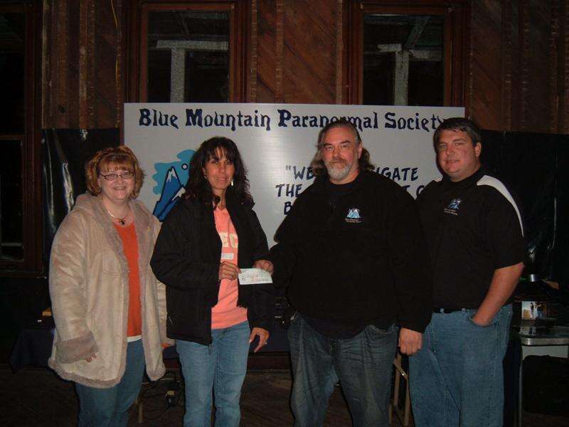 Carbon County Friends of Animals Director Kim Mulik (second from left) accepts check from Blue Mountain Paranormal Society Senior Investigator Danny Strohl (second from right) in the amount of $550 raised during a public investigation at Broney's Hotel in Mahoning Township on Saturday evening. The group designated the night CCFOA Night and all proceeds and donations went to the CCFOA. Pictured are (left to right): CCFOA Volunteer Amy Behrens, Mulik, Strohl and BMPS Co-Founder Bob Schaeffer.