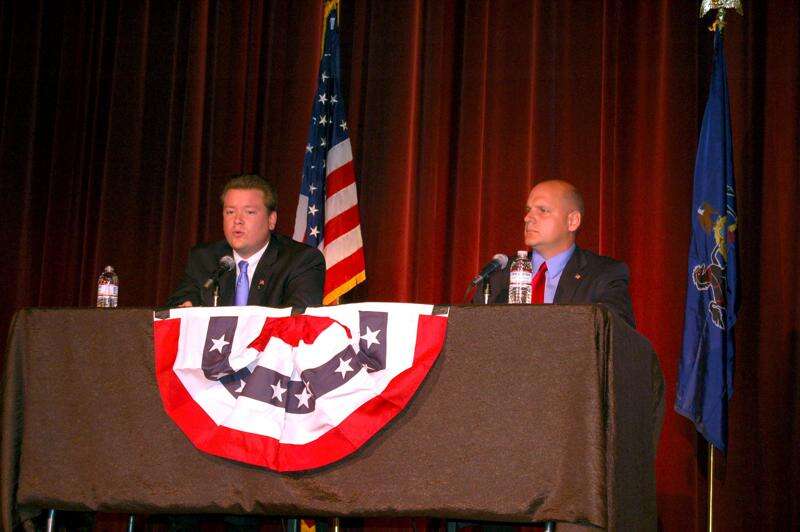 CHRIS PARKER/TIMES NEWS Candidates vying for election to the office of state Representative of the 122nd District debate the issues at Mauch Chunk Opera House on Wednesday. On the left is Democrat Justin Yaich of Jim Thorpe. To his right is Republican candidate Doyle Heffley of Lower Towamensing Township.