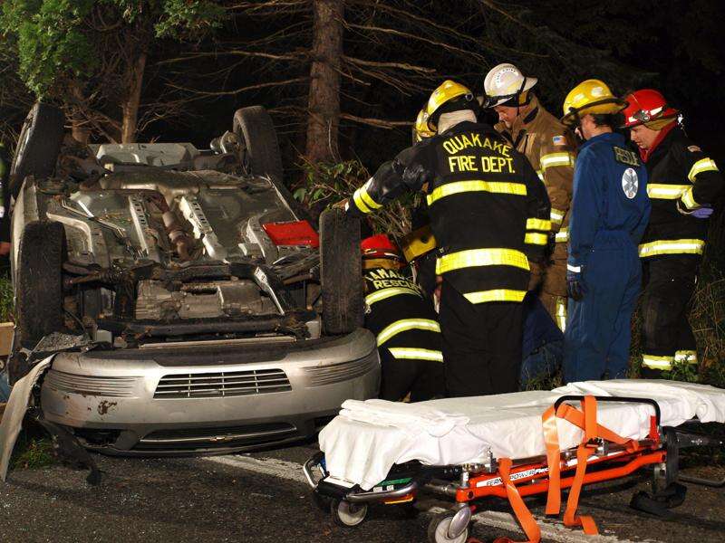 Rescue personnel work to extricate a male driver from a Chevrolet sedan that rolled over in Rush Township early Friday morning. The accident took place on Pine Creek, Drive, SR54, between Hometown and Barnesville, at approximately 2 a.m. after the driver lost control of his vehicle on a curve. The vehicle then struck a utility pole support wire, rolled over and landed on its roof. The Jaws of Life were used to extract the man from the car. He was then taken to the Hometown Farmers Market via ambulance, transferred to an awaiting Medivac helicopter and transported to an Allentown area trauma center. Rush Township Police were assisted at the scene by firefighters, rescue workers and fire police from Rush and Ryan Townships, Tamaqua and McAdoo.