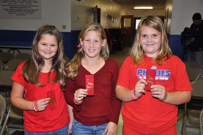 AMY MILLER Fourth grade students Kelsey Carroll, left; Caroline Snerr, center; and Rhiannon Malarkey, proudly show off their red ribbons saying they are drug free during a drug awareness program at St. Joseph's Regional Academy on Monday.