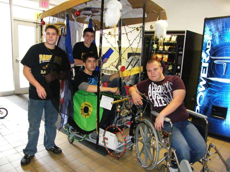 CAROL ZICKLER/SPECIAL TO THE TIMES NEWS First place float at PVHS Panther Valley High School held its first annual Homecoming Float Parade in conjunction with a Pep Rally at the school on Friday. Thirteen floats competed for a prize. The first place winner was the PVHS Hag Wagon with the PVHS Band as the occupants. Seen are Greg Danchak, in wheel chair, pulling a grocery cart with Jeremy Thomas, Tyler Suzadail, and Stephen Romanchik.