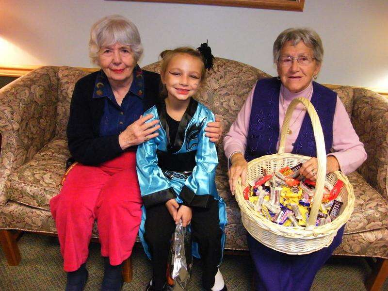 Residents at MapleShade Assisted Living Center in Nesquehoning treated costumed children at a Halloween party held for the children at the residence. Candy was distributed as well as a drink and homemade goodies. The residents really looked forward to talking with the youngsters and of course the children enjoyed all of the treats. Seated are Marjorie Sasserath resident, Chloe Diekman in costume, and Marie Badowsky resident.