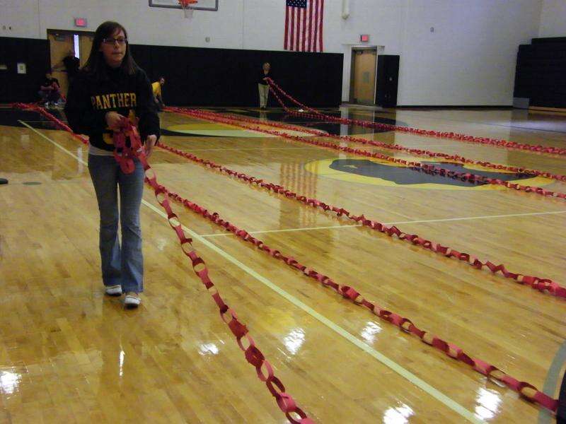 Carol Zickler/Times News Jessica Wiese holds the longest chain of ribbons sold during Red Ribbon Weekat the Panther Valley Middle School, part of the say NO to drugs campaign.