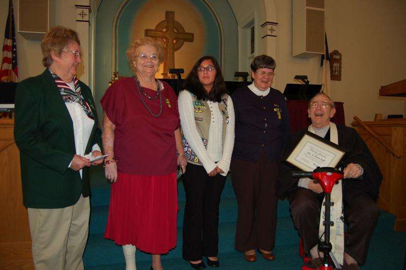 The Rev. Wilson Scott, pastor of First Presbyterian Church, Third and Mahoning streets, Lehighton, was presented the award during Sunday's church service."Thank you for all you've done for Girl Scouting for so many years," said Geri Haas, leader of Cadette/Senior Troop 3583.For many years, Girl Scouts have held meetings in the church and Katherine Hosler, service unit director for Lehighton Girl Scout leaders, presented the award, "This award recognizes that you helped build girls of courage, confidence and character so they can create a better world tomorrow.""Thank you for all you've done for Girl Scout," said Janet Rimbey. "I used to meet here when I was the leader of Brownie Troop 604 many years ago."The Rev. Scott, said "Thank you for the honor," as he accepted the award.
