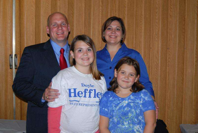 Ron Gower/TIMES NEWS Doyle Heffley, who was elected to represent Carbon County in the Pa. House of Representatives,with his wife, Kellie, and his children, Elizabeth, left, 13, and Angela, 9, at last night's victory party in the Bowmanstown Fire Company.