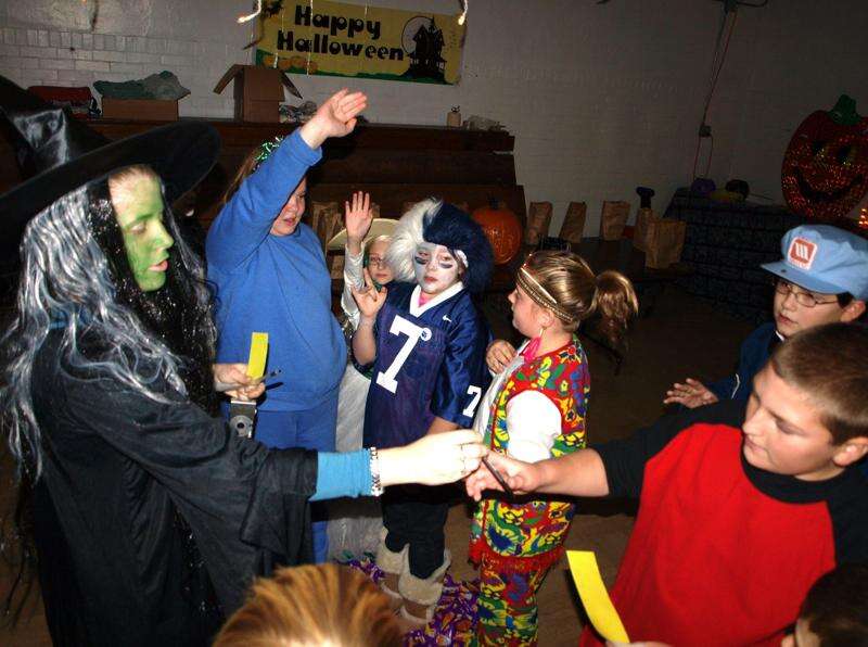 ANDREW LEIBENGUTH/SPECIAL TO THE TIMES NEWS C.H.O.S.E. president Angela Krapf, on left dressed as a witch, provides activities for children to play during their C.H.O.S.E. free 8th Annual Community Children's Halloween Celebration held recently at the Coaldale Complex.