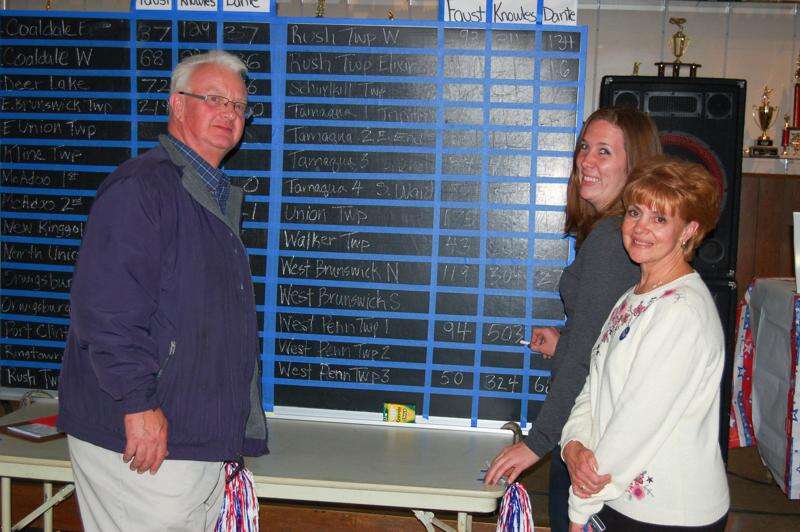 JOE PLASKO/TIMES NEWS State Representative Jerry Knowles, left, checks the figures for the 124th District with his aide, Lauren Miller, second from right, and his wife Lorraine, far right, at his Election Night headquarters at the New England Fire Company Tuesday night. Knowles won reelection to his seat, which represents eastern Schuylkill and northern Berks Counties.