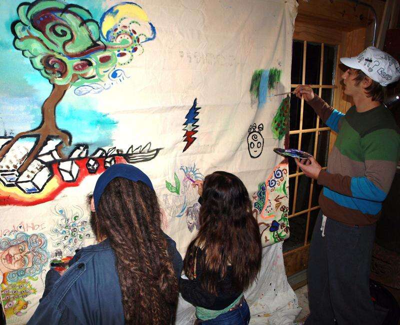 Pictured taking part in collaborative artwork during the Astral Dance event held last month at the Stonehedge Gardens in South Tamaqua are, from left, collaborative artist Brendan Gallagher, of "PANdelphia;" Melissa Najarian, Kempton; and Jason Steinbrunn, New Ringgold. For more information about future art shows or events visit