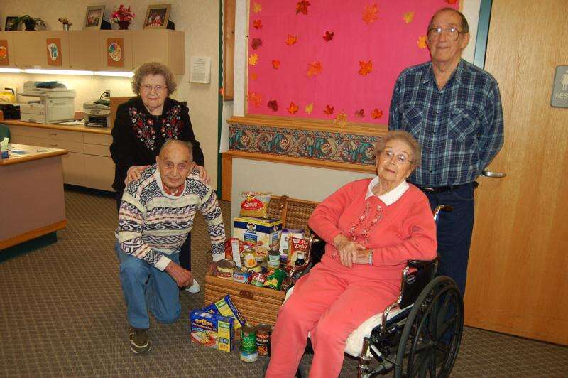 Clients of the Palmerton Hospital Adult Day Center have been collecting canned goods to donate to Christians in Action Council of Palmerton Area Churches (CACPAC). Pictured are clients Herman Smith (kneeling), Naomi Costenbader (in wheelchair), Marie Nikisher (back row) and Charlie Silliman, pantry coordinator.