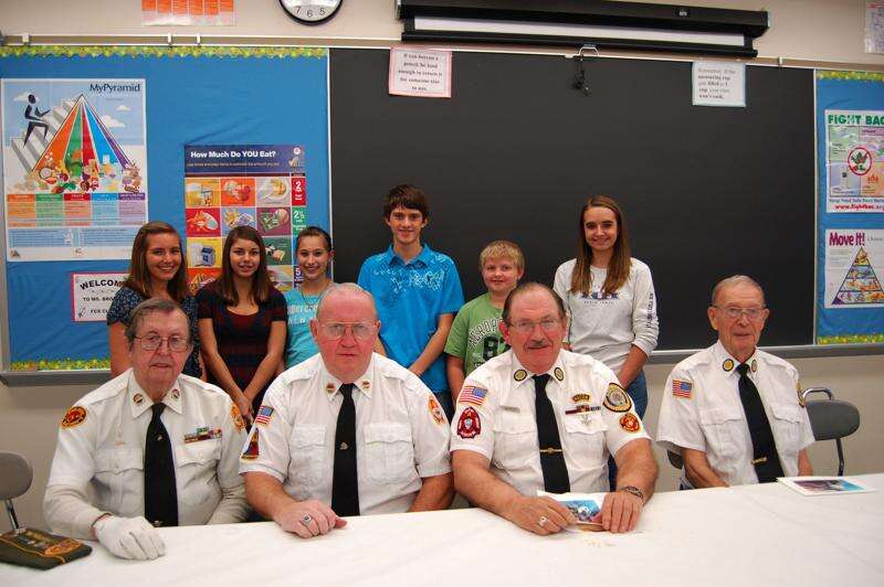 Student Advisory Council of the Lehighton Area Middle School served lunch to veterans taking part in the LAMS Veterans Celebration program. Among the veterans at the luncheon were, from left, Randy Rabenold, USMC; Dave Armbruster, Army; Larry K. Heffley, Sgt. at Arms; Carl C. Christman, Army Air Force. Student Advisory Council members who prepared and served the meal were, from left, Kelsey Andrews, Hannah Gilbert, Sophia Everett, Matt Shanton, Brady Neihoff and Lexus Hoppes.