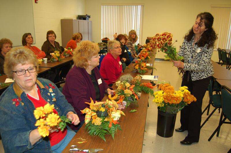 Ruth Phillips from Miller's Flower Shop in Sciota, help ladies make beautiful fall centerpieces at the Penn State Cooperative Extension in Monroe County's Annual Holiday Program held at the Monroe County Public Safety Center in Snydersville. Left to right, Pat Grainger of Cresco and Donna Bartosiewicz of Swiftwater got to explore their floral arranging talents during one of the two crafting workshops offered.