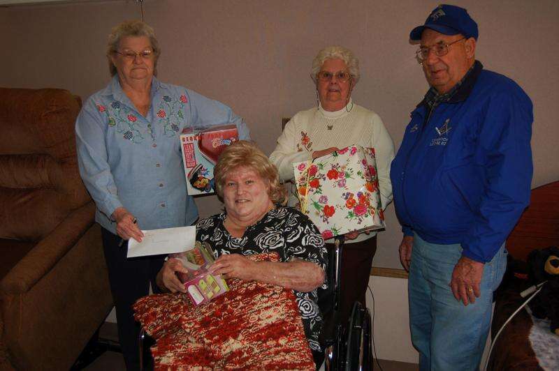 JOE PLASKO/TIMES NEWS Corrie Miller of Jim Thorpe, seated in wheelchair, receives gifts from a housewarming shower organized by members of the Gnaden Huetten Chapter of the Order of the Eastern Star.