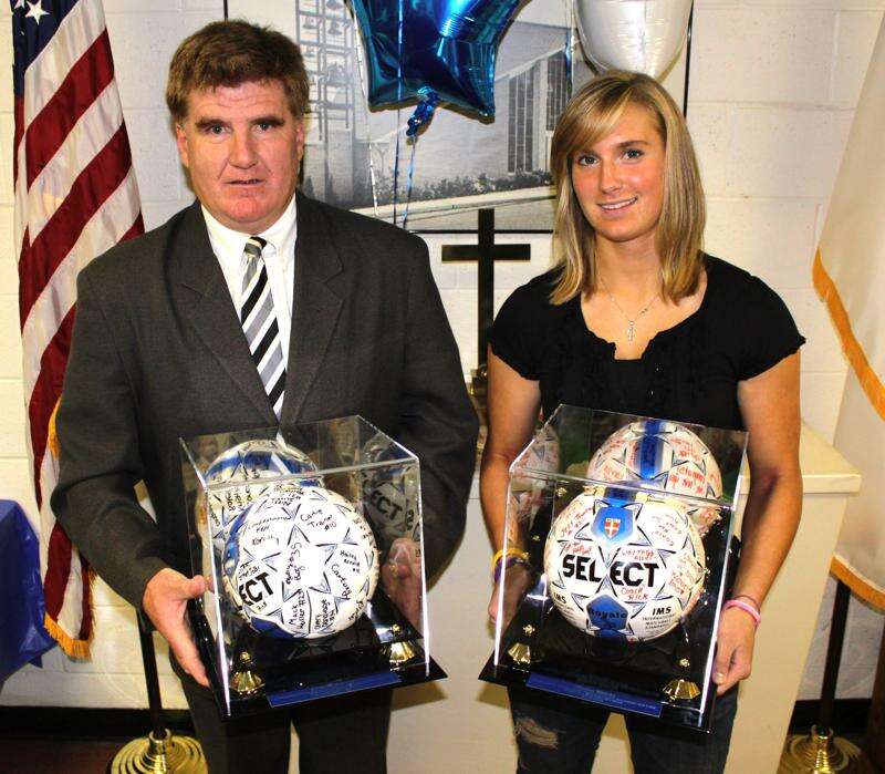 @Caption Stand Alone:Raider soccer award winners Two encased and signed soccer balls were presented at the recent Tamaqua Lady Raider banquet. The ball were given to senior Allsion Updike (right) for being the school's career scoring leader (88 goals) and to coach Clem McCarroll for earning his 100th win earlier this season in a game against Pine Grove.