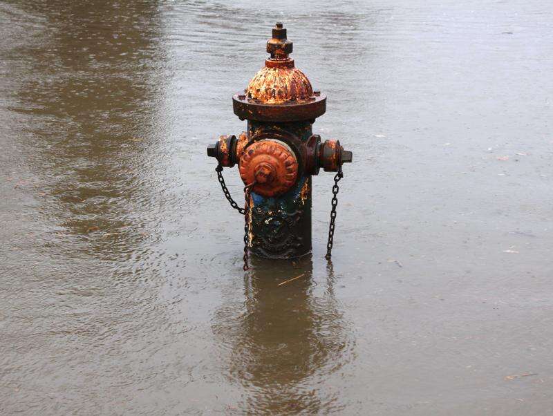 Flash flooding in Hometown yesterday made it difficult for drivers to travel. Quakake Fire Company, Hometown Fire Company, Hometown Fire Police, Rush Township Police and borough workers worked to clear streets and block access to flooded areas. Pictured is a fire hydrant on Wyoming Street.