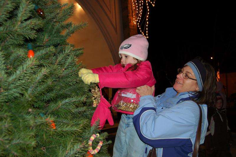 Clarissa Smyth, a member of Daisy Troop 38, places decorations on the Christmas tree at the Lehighton amphitheater, as she is held by Raegan Smyth, her mom and her leader.