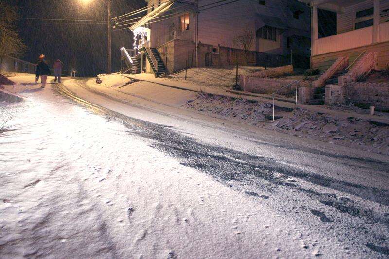 Monday's snowfall and cold temperatures made for unsafe driving conditions. Pictured is a snow and ice-covered hill in New Philadelphia in which a driver damaged her car after sliding down it.