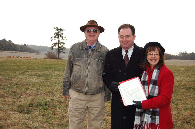 The three met in the field behind Jack River's Steakhouse where a new municipal building will be constructed. The project received a financial boost from Rep. McCall, which is part of the Redevelopment Assistance Capital Program.McCall said a special act had to be passed to make the money available. This is the Capital Budget Project Itemization Act of 2010-82.A letter from the Office of the Budget said Gov. Ed Rendell had authorized the release of the money."It's very special to get this kind of money in the township," said McCall. "It is very competitive."He said the state received billions in requests. One of the reasons the township received the money was because it is experiencing developmental growing pains. It needs the new facility to provide better service to the residents.Kleintop said a large part of the building will be a community center for use by "senior citizens, Scouts, 4-H, whatever," everyday.The plan also has rentable space for other government offices.A test well has been drilled and the land found suitable for geothermal heat, said Kleintop. Bruce Steigerwalt, project engineer, oversaw the work.The land is paid for but there is no fixed figure for the cost of the entire project roughly estimated at $4 million. It is still in the design stage.Although there may be room for a state police barracks, they are required to have a separate building.Kleintop told McCall that the supervisors are appreciative of his help.Since the project will be part of the jobs stimulus effort, an estimate of potential job impact and economic stimulus will have to be provided. Applicants must prove they have funding for one-half of all costs not covered by the state grant. Prevailing wage will be required.Work must begin within six months of the execution of the grant agreement.