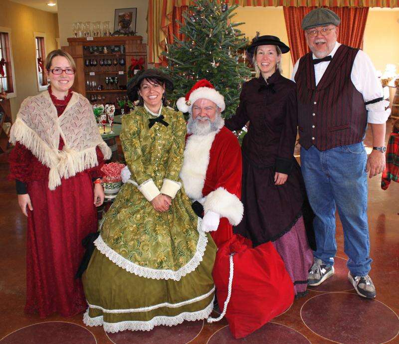 Children and visitors to the Galen Glen Winery and Vineyard in Andreas were encouraged to enjoy Santa Claus and staff wearing old fashioned Victorian-style clothing during the annual Old Fashioned Open House held recently. Children sat on Santa's lap as he gave them candy canes and miscellaneous gifts. Sarah Troxell, Galen Glen owner, pointed out the increase in holiday visitors every year. Pictured with Santa Claus and wearing old-fashioned Victorian holiday attire are from left Erin Troxell, Karen George, owner Sarah Troxell, and Harry Weaver.