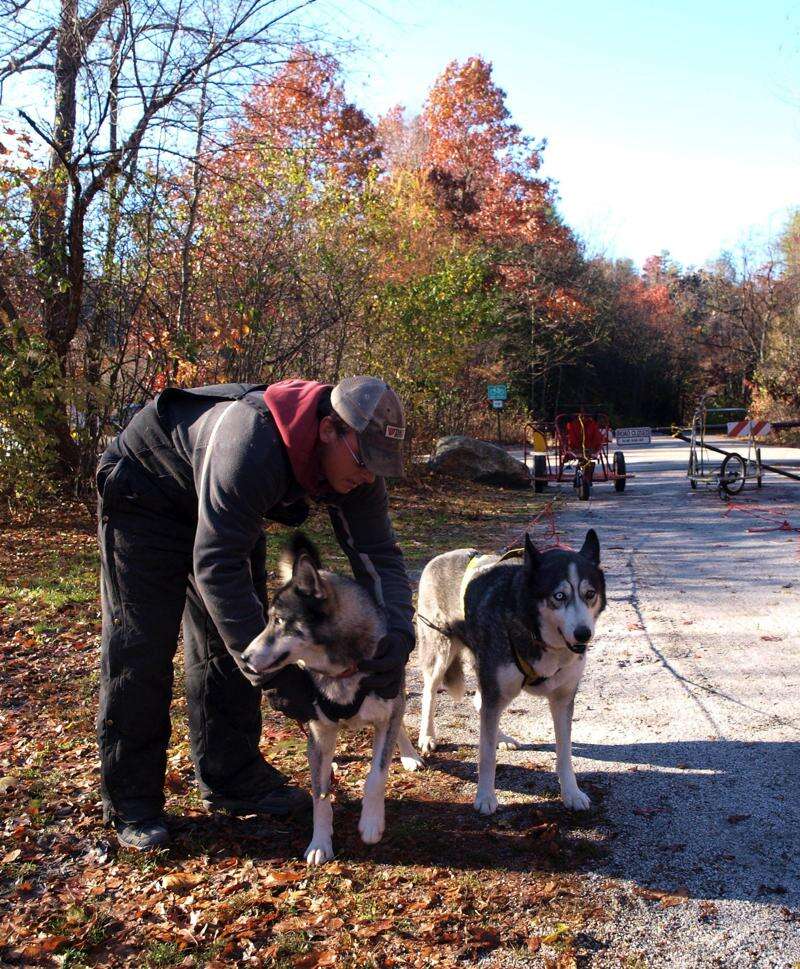 "That's one of the things you want to look for in a breed, whether a pet or a working breed. They're a sociable, loving dog, and are great around children."MacMillian's Huskies are working dogs, and he has 15 of them: Alaskan Huskies, Siberian Huskies, and Alaskan Malamutes.Ninety-pound Alaskan Malemute Ma-Luk, meaning Big Foot, is the company's namesake."He is energetic, loving, social, and a very powerful dog," MacMillian said. "He has pulled 3,000 pounds by himself in weight pulls."MacMillian was harnessing his dogs at the Lehigh Gorge Trail Glen Onoko Access on a brisk November Sunday morning. The temperature was hovering just above freezing-cold enough for most people, but not for MacMillian's sled dogs."They like anything below zero," he said. "The dogs run their best below zero. Above 50 degrees, the dogs tend to overheat and don't want to work."MacMillian started running his dog teams in early fall and will continue until March. Then, its rest and relaxation through the spring and air conditioning in the summer.Now that it's autumn, the dogs can't wait to run. Tied to his truck the dogs were yipping and jumping, full of energy and ready to run. If left off leash, they would take off."Huskies are a nomadic dog," MacMillian explained. "They like to roam and run in big packs. Off-leash they smell things, and hunt things down. They have a high prey drive."MacMillian lays out a gang line and sets his lead dogs to hold the line taut. The dogs behind them are the point dogs, and then behind them are the wheel dogs - the main pulling power of the team."The leaders are the brains of the team," MacMillian said. "They take on all the responsibility for all the other dogs. They need to be a dog that likes to have other dogs running behind."For the past 10 years, MacMillian's Ma-Luk Sled Dog Adventures has offered dog sled rides and tours throughout the Poconos. He has been working with dogs for 20 years.As a child, MacMillian's family was into showing of dog breeds and field trials."I wasn't allowed to have a husky until I got older," he said. "Then, I read about the different breeds, talked to a lot of people, and bought my first dog. Then, I got a couple more dogs, and a couple more dogs after that - to go farther and faster."You might catch MacMillian in the early morning on a cold Sunday at the entrance to the Glen Onoko Trail. At the beginning of the season, he takes his dogs on a training run."We want to get the miles on the dogs before winter hits," he explained. "We start out doing a mile, work our way up to five miles, then ten miles, then 15 miles, and eventually 30 miles."To many people, this brings up visions of the Alaskan Iditarod Sled Dog Race, a 1,161 miles journey that a team of 16 dogs cover in nine to fifteen days. The race commemorates how, in 1925, when Nome was hit with a diphtheria epidemic, a relay of dog sled teams saved lives by transporting the vaccine nearly 1,200 miles from Anchorage to Nome. In 1973, the Iditarod was created in memory of that event.Arrangements for a dog sledding adventure can be made through the Inn at Jim Thorpe. For information, email