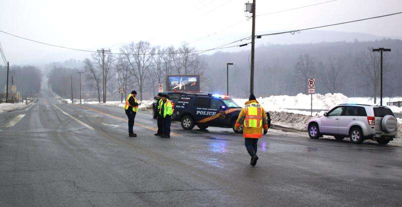 Saturday's weather caught most drivers off-guard as early-morning freezing rain and sleet provided our area roadways with a layer of slick ice that made traveling very dangerous. Pictured are West Penn Police and fire police staged at the SR-309 and SR-443 intersection in Snyders while they close the road and crews remove a stuck tractor trailer located on the other side of the Blue Mountain hill and while PennDOT de-ices the roadway.