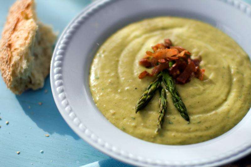 But whenever you eat it, asparagus is a nutritional powerhouse. It is low in calories (about 5 calories per stalk) and is packed with vitamins A, C and E, and folate.Green, purple and white varieties of asparagus are common, though green is the least expensive and most readily available. Green asparagus has a fresh, woodsy flavor, while purple varieties tend to have a more fruity flavor. White asparagus is milder in flavor and should always be peeled before cooking.When shopping for asparagus, look for firm stalks with tight tips. Fresh asparagus should snap when bent. Though best eaten the day purchased, asparagus can be refrigerated, wrapped in a damp cloth inside a plastic bag, for three days.Though not essential, peeling tough-skinned stalks with a vegetable peeler will help ensure that the tips and otherwise thicker stalks cook at the same rate. And be sure to rinse all asparagus thoroughly before cooking to remove any lingering sand.For this simple asparagus and potato soup, all the vegetables are roasted at high heat, caramelizing their natural sugars and enhancing the flavors. They then are pureed until smooth and combined with thick, nonfat Greek-style yogurt, which gives the soup a creamy quality that belies its low-fat nutritional profile.To top off the soup, shreds of sweet and salty prosciutto ham are crisped in a skillet to create a garnish that has all the appeal of crumbled bacon, without all the grease.Roasted asparagusand potato soupStart to finish: 1 hour (15 minutes active)Servings: 46 cloves garlic1 pounds asparagus, bottoms trimmed, cut into 1-inch pieces (about 3 cups)2 cups peeled and diced Yukon Gold potatoes1 medium sweet onion, cut into 6 wedges1 tablespoon extra-virgin olive oil1/2 teaspoon salt, plus more to taste1/2 teaspoon ground black pepper, plus more to taste2 ounces prosciutto, chopped3 cups chicken broth, divided6 ounces nonfat plain Greek-style yogurt1 teaspoon lemon juice1 tablespoon minced fresh tarragonHeat the oven to 425 F.Place the garlic on a square of foil and sprinkle with 1 teaspoon water. Fold the foil into a packet. Set aside.In a large bowl, combine the asparagus, potatoes, onion, oil, 1/2 teaspoon salt and 1/2 teaspoon of black pepper. Toss to coat. Spread the vegetables over 2 large, rimmed baking sheets. Place the packet of garlic in one corner of one of the sheets. Roast, stirring occasionally, until the asparagus pieces are soft and the potatoes are tender, 35 to 45 minutes.Meanwhile, in a small skillet over medium, crisp the prosciutto, about 5 minutes per side.When the vegetables are roasted, empty the garlic onto the baking sheet with the other vegetables and cool for 5 minutes.Transfer half of the vegetables into a blender. Add 1 1/2 cups of the broth, then blend until smooth. Transfer to a large pot. Repeat using the remaining vegetables and remaining 1 1/2 cups of broth. Warm the soup over medium heat.Whisk the yogurt, lemon juice and tarragon into the soup. Season with salt and pepper to taste. Crumble the prosciutto and use to top each serving.Nutrition information per serving (values are rounded to the nearest whole number): 233 calories; 53 calories from fat (23 percent of total calories); 6 g fat (1 g saturated; 0 g trans fats); 12 mg cholesterol; 33 g carbohydrate; 13 g protein; 5 g fiber; 1,355 mg sodium.
