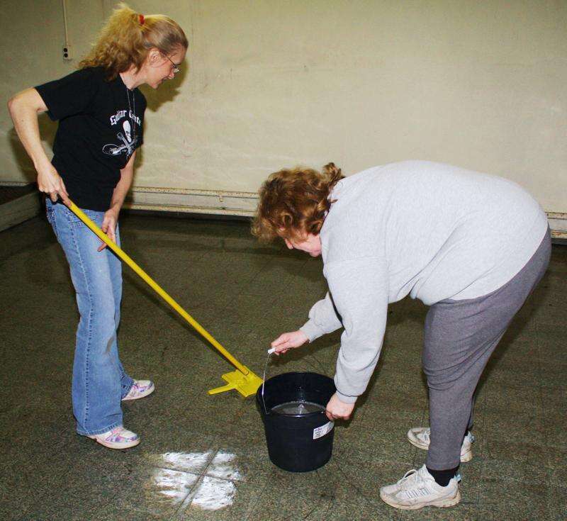 ANDREW LEIBENGUTH/TIMES NEWS A number of volunteers came together recently to clean the downstairs of the Tamaqua Community Center. They want to have the downstairs readily available for future events, such as crafting classes which will be held in the basement area starting on Thursday April 5 at 6 p.m. Another cleanup session, to include painting, will be held this Sunday at the center, 125 Pine St., starting at noon. All are invited. Contributors are encouraged to bring paint brushes, paint rollers and a gallon of exterior semi-gloss white paint. For more information contact center director Micah Gursky at (570) 668-6899 or via the Tamaqua Area Community Partnership website, <a href="http://www.tacp.info">www.tacp.info</a>. Giving the downstairs floor a clean glow are volunteers Kathleen Quinn-Farber, with mop, and Rose Jean Zucuskie.