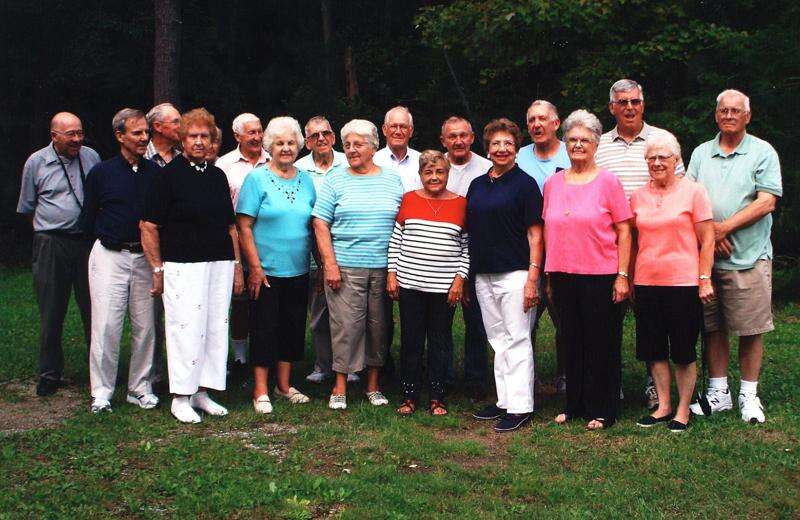 (Dunbar) Dotter, Sally (Dunbar) Klotz, Lucille (Sander) Tusan, Marilyn (Mohr) Epperly,Barbara (Snyder) Yakubecek, Eileen (Beers) Schmutz and Teresa (Sander) Walck. Second row, John Schmutz, Franklin Andreas, Elmer Daneker, Richard Edwards, Delbert Eckhart, Thomas Lewis, Bruce Rehrig, Lawrence Rehrig, Robert Costenbader and Nicholas Radvon.