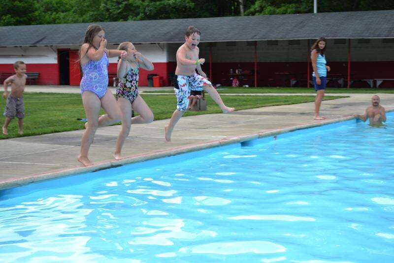 Despite the cooler temperatures, several area children couldn't wait for opening day at the Lansford Pool. Kyanna Dilliard, left, 11, Hannah Slivkanich, center, 9 and Dominic Oplinger, right, 9, jump into the newly-painted pool on Saturday. The pool is open daily from noon to 7 p.m.