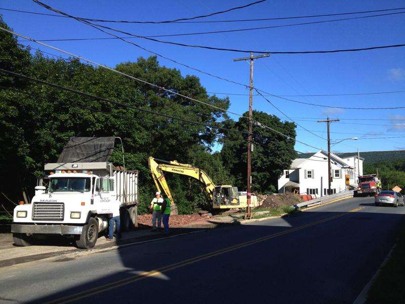A crew removes debris from a house that was demolished Tuesday on Rt. 903 at the intersection of North Street and West Front Street in East Jim Thorpe to make way for a new bridge across the Lehigh River. The house is the most recent to be razed of approximately eight homes acquired by PennDOT in the vicinity of the bridge egress.