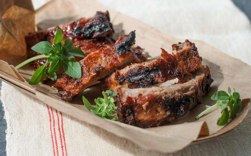 This May 5, 2014 photo shows Memphis-style baby back ribs in Concord, N.H. Back ribs usually are sold in either full slabs (13 ribs) or half slabs (7 ribs), and are the most expensive cut of rib. When they come from a pig that was less than a year old, they are referred to as ¨babyÆ back ribs. (AP Photo/Matthew Mead)
